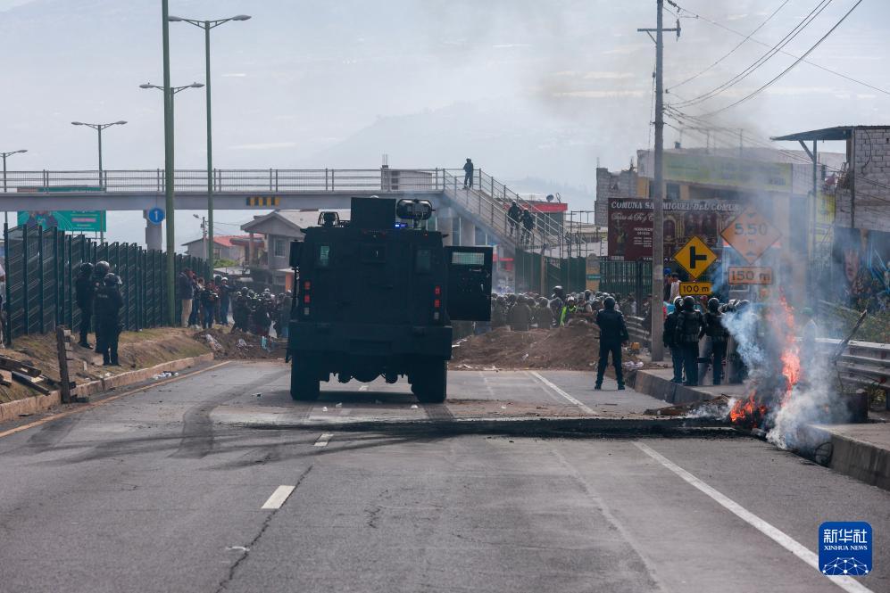 9月16日,在厄瓜多尔首都基多,武装部队人员在公路旁维持秩序。新华社发(里卡多·兰德塔摄)