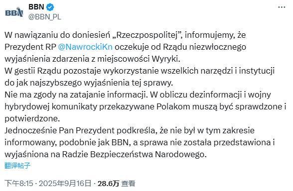 波兰国家安全总局16日在社交媒体上就相关报道回应说,“波兰总统卡罗尔·纳夫罗茨基希望政府能够及时澄清事件”“调动所有工具和相关政府部门尽快解决这一事件是政府职能所在。”