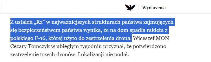 《共和国报》在16日刊发的报道中说:“本报从国家安全部门重要机构获悉,波兰F-16战机发射导弹试图击落无人机时,因制导系统故障击中了民宅。”此外,该报援引军事专家的话称,导弹引信的安全装置启动了,因此落入民宅的导弹并没有发生爆炸。