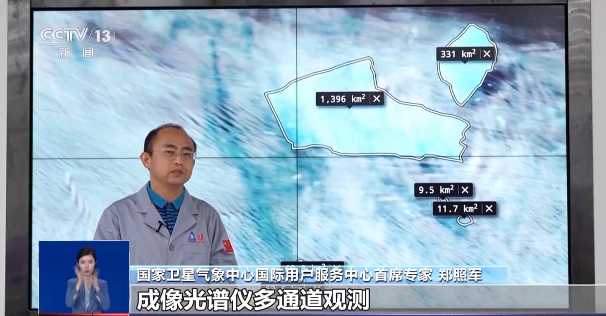 国家卫星气象中心国际用户服务中心首席专家 郑照军:我们利用风云三号250米的中分辨率成像光谱仪多通道观测,对这块冰川的变化跟移动做了一个详细的监测,提取它的面积跟位置,形成了2023年到2024年这两年的一个监测图像。
