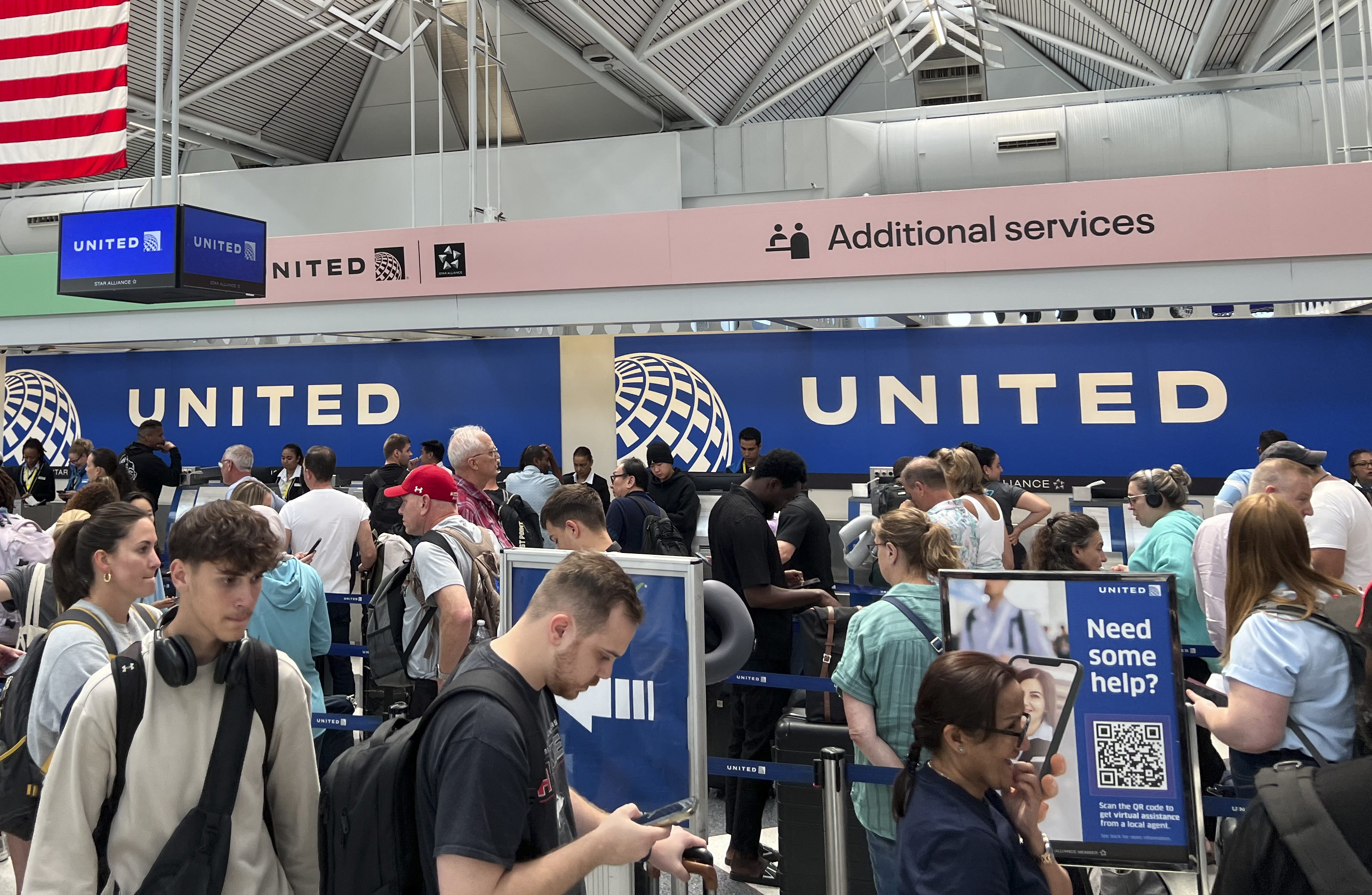 2024年7月19日,乘客在美国芝加哥国际机场等待航班信息。新华社记者颜亮摄