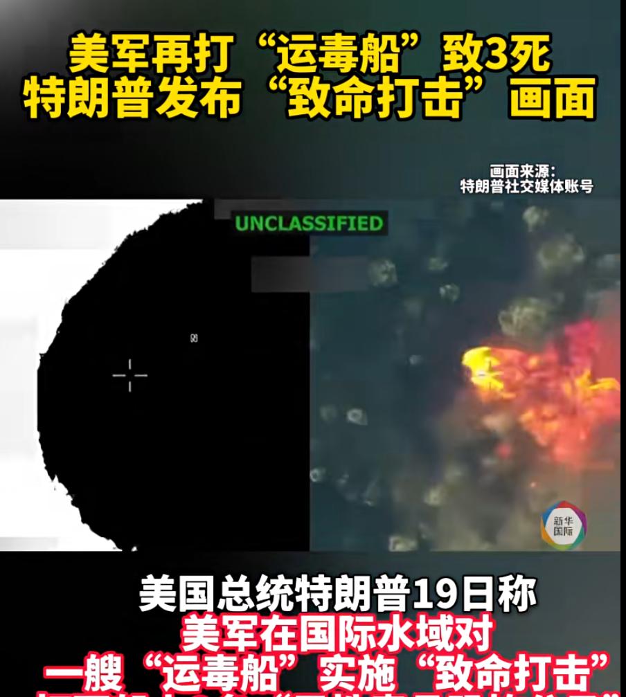 特朗普在社交媒体上发帖称,按照他的命令,美军“对隶属于指定恐怖组织的运毒船实施致命动能打击”,“该船在美国南方司令部责任区内从事毒品贩运活动,经情报确认正沿已知贩毒通道航行,企图向美国输送非法麻醉品”。