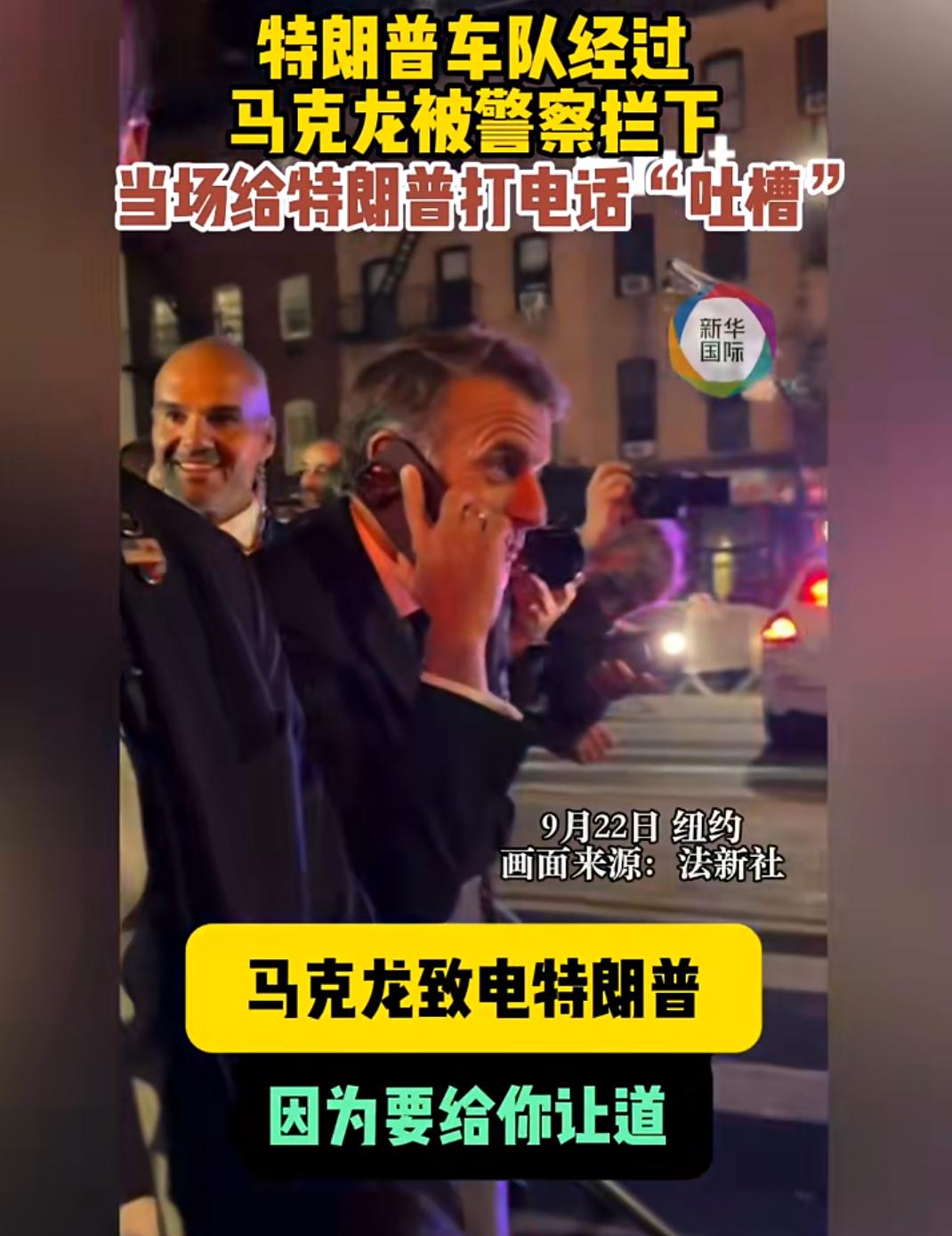 据新华社消息,当地时间22日,在美国纽约街头,因美国总统特朗普的车队经过,前来参加第80届联合国大会的法国总统马克龙被警察拦在路边。马克龙当场拿出手机给特朗普打电话“吐槽”:“你猜怎么着?我这会儿正在大街上等着,因为要给你让道。”