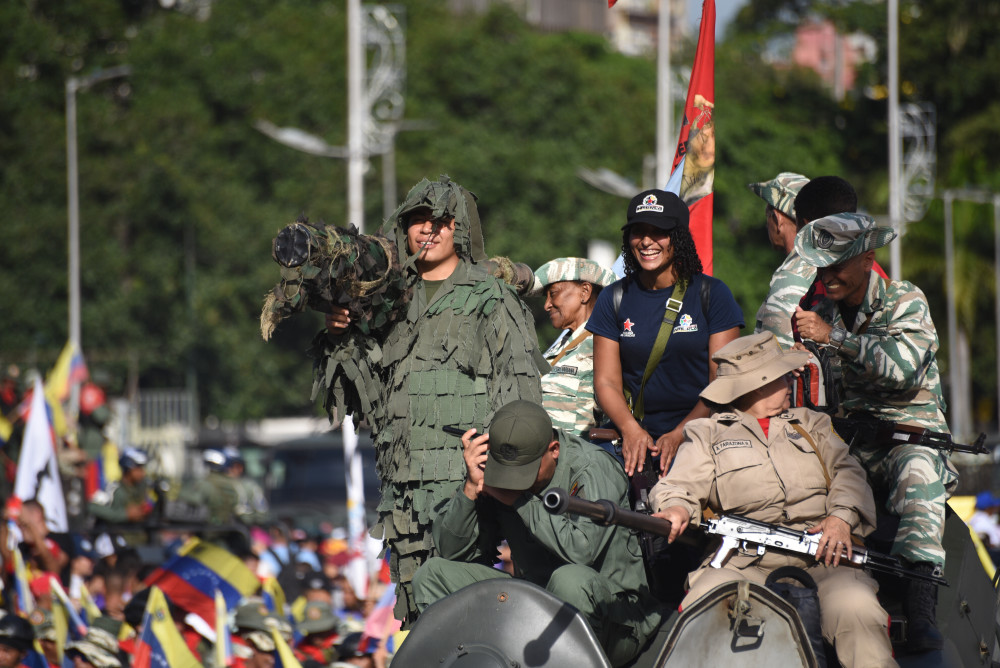 9月23日,在委内瑞拉首都加拉加斯,玻利瓦尔民兵组织成员携带武器、挥舞委内瑞拉国旗参加游行。新华社发(马科斯·萨尔加多摄)