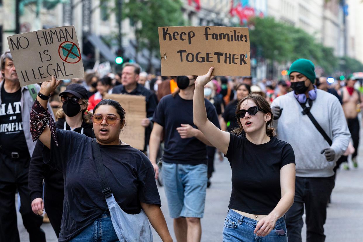 6月10日,在美国芝加哥市中心,人们手持标语参加抗议活动。新华社发(文森特·约翰逊摄) 特朗普今年1月重返白宫以来,授命移民与海关执法局在美国各地实施搜捕、拘押和遣返非法移民的行动,在多个民主党主政地区引发示威和骚乱,移民安置场所频繁成为执法人员与抗议者的冲突现场。