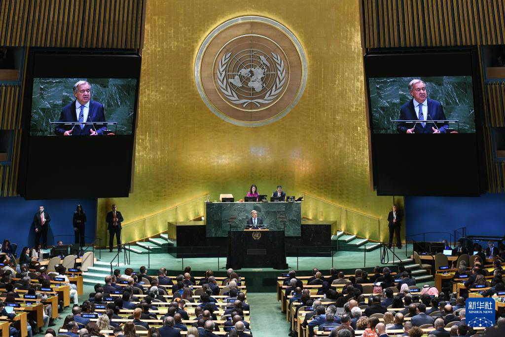9月23日,在位于纽约的联合国总部,联合国秘书长古特雷斯在第80届联合国大会一般性辩论开幕式上致辞。新华社记者李睿摄