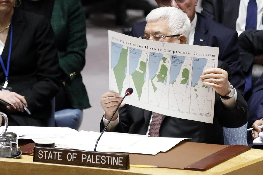 2020年2月11日,在位于纽约的联合国总部,巴勒斯坦总统阿巴斯在安理会中东局势和巴勒斯坦问题公开会上手持地图发言。新华社记者李木子摄