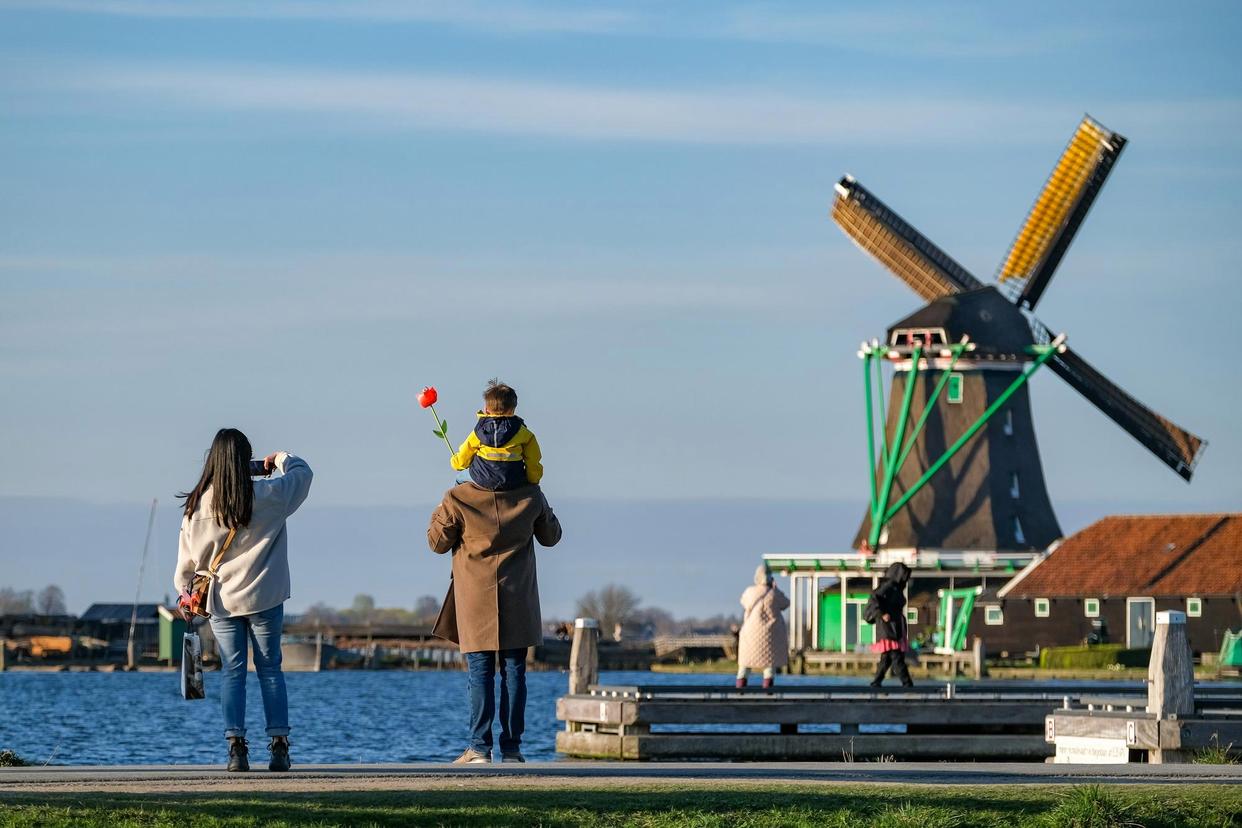 2022年3月26日,游客在荷兰赞丹的桑斯安斯“风车村”观光游览。新华社记者张铖摄