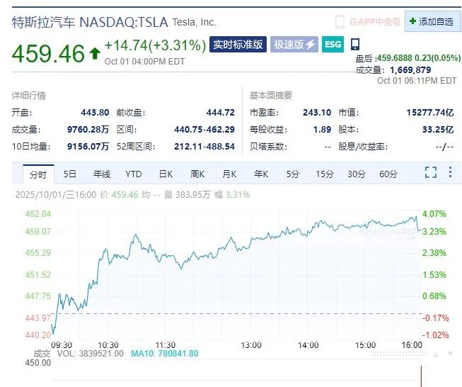 另据每日经济新闻报道,当地时间10月1日,美股三大指数集体收涨,道指涨0.09%,纳指涨0.42%,标普500指数涨0.34%。特斯拉报459.46美元,涨3.31%,最新市值1.53万亿美元,其市值一夜增加490亿美元(约合人民币3489亿元)。