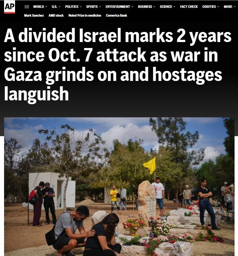 美联社7日发布的一篇报道关注了两年来加沙的冲突仍在持续,被扣押人员还在挣扎,与此同时以色列内部正在分裂。报道称,10月7日以色列人准备悼念遇难者,然而主要的悼念仪式是由遇难者家属组织的,而不是以色列政府。这反映出人们对内塔尼亚胡政府存在深刻分歧,许多人认为迟迟未能达成停火协议救回被扣押人员的主要责任方就是内塔尼亚胡。