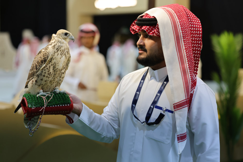 10月6日,在沙特阿拉伯首都利雅得,沙特游客体验和鹰隼合影互动。新华社记者 王海洲 摄