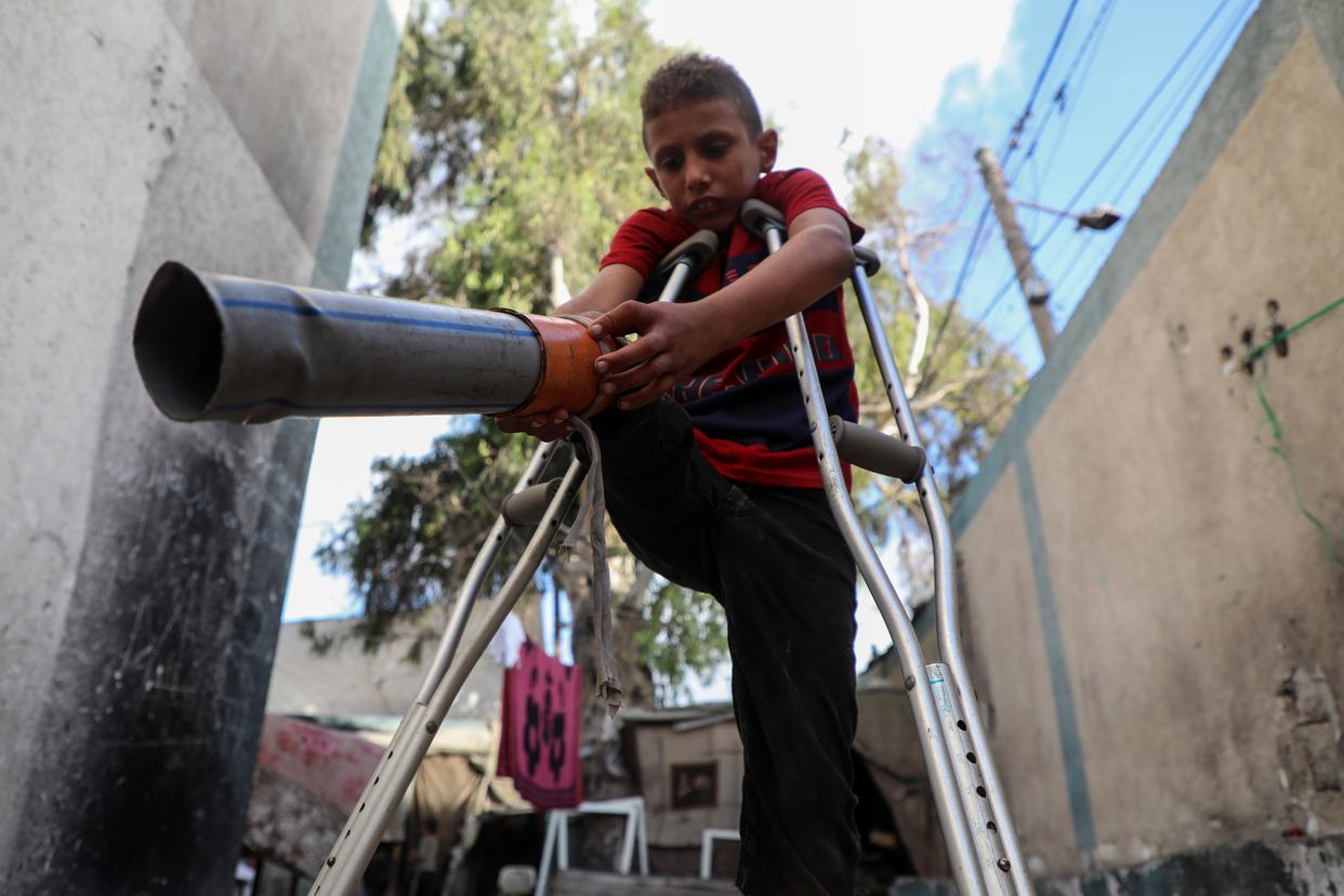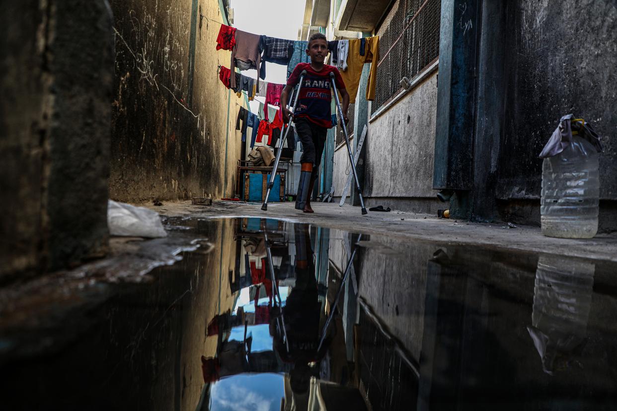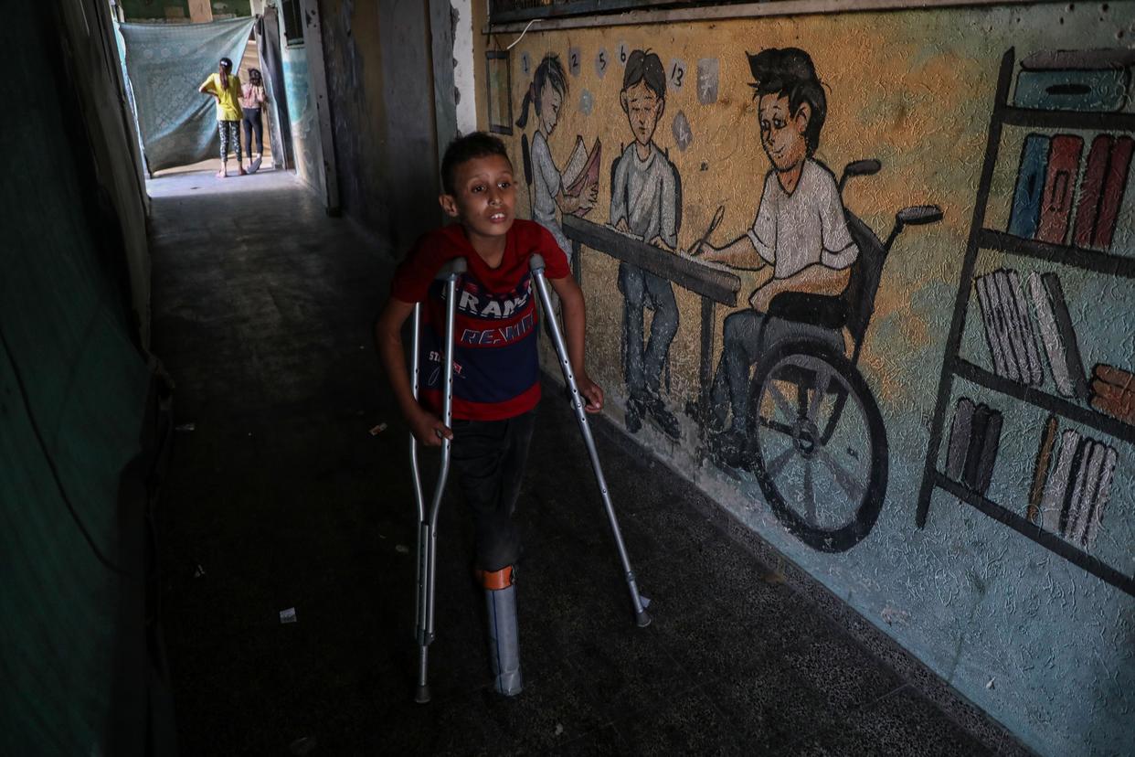 10月5日,年仅10岁的少年拉提卜·阿布·卡里克在加沙地带中部代尔拜拉赫附近的联合国临时安置机构内拄着拐杖安装假肢。在数月前的一次以色列空袭中,拉提卜失去了右腿致残,他的母亲和兄弟也在袭击中身亡。新华社发(里泽克·阿卜杜勒贾瓦德摄)