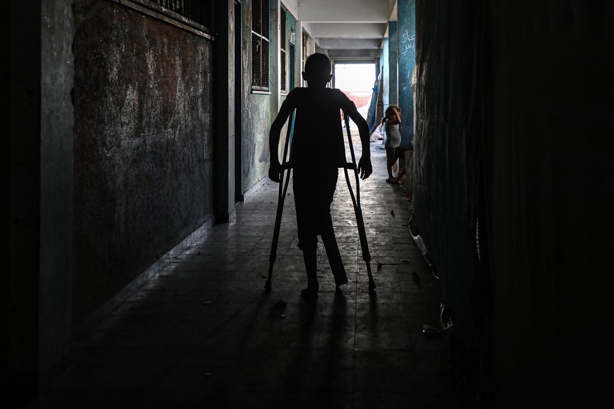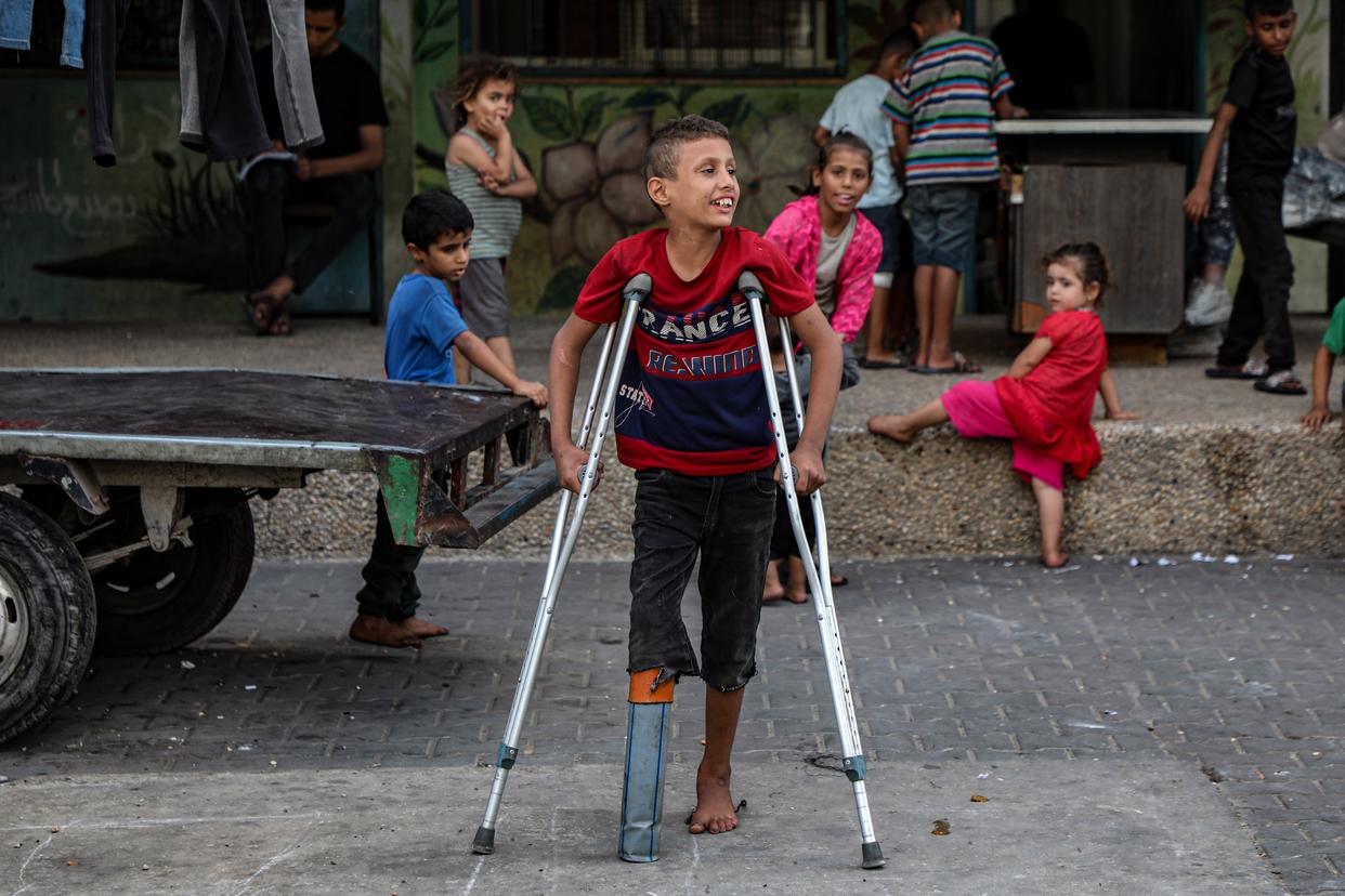 10月5日,年仅10岁的少年拉提卜·阿布·卡里克在加沙地带中部代尔拜拉赫附近的联合国临时安置机构内拄着拐杖行走。在数月前的一次以色列空袭中,拉提卜失去了右腿致残,他的母亲和兄弟也在袭击中身亡。新华社发(里泽克·阿卜杜勒贾瓦德摄)