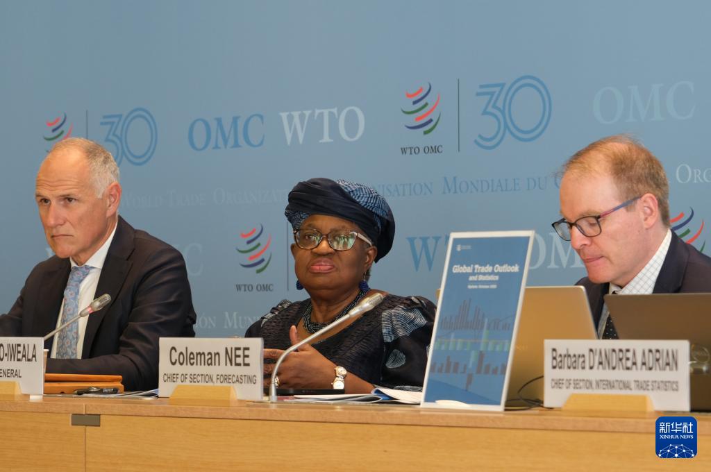 10月7日,在瑞士日内瓦世界贸易组织总部,世贸组织总干事伊维拉(中)在新闻发布会上讲话。新华社记者 马汝轩 摄