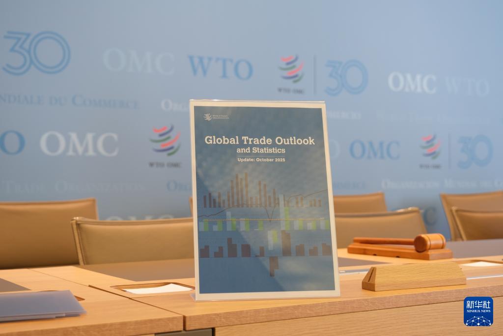 这是10月7日在瑞士日内瓦世界贸易组织总部拍摄的当日发布的最新全球贸易展望报告封面。新华社记者 马汝轩 摄