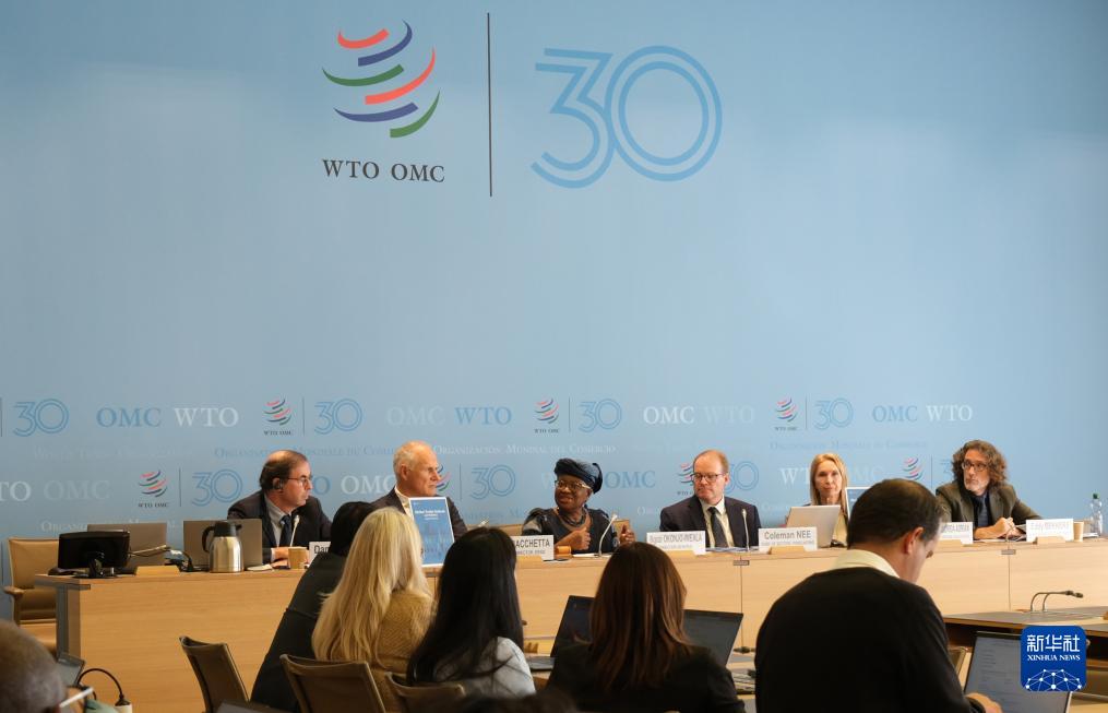 10月7日,在瑞士日内瓦世界贸易组织总部,世贸组织总干事伊维拉(后左三)在新闻发布会上讲话。新华社记者 马汝轩 摄