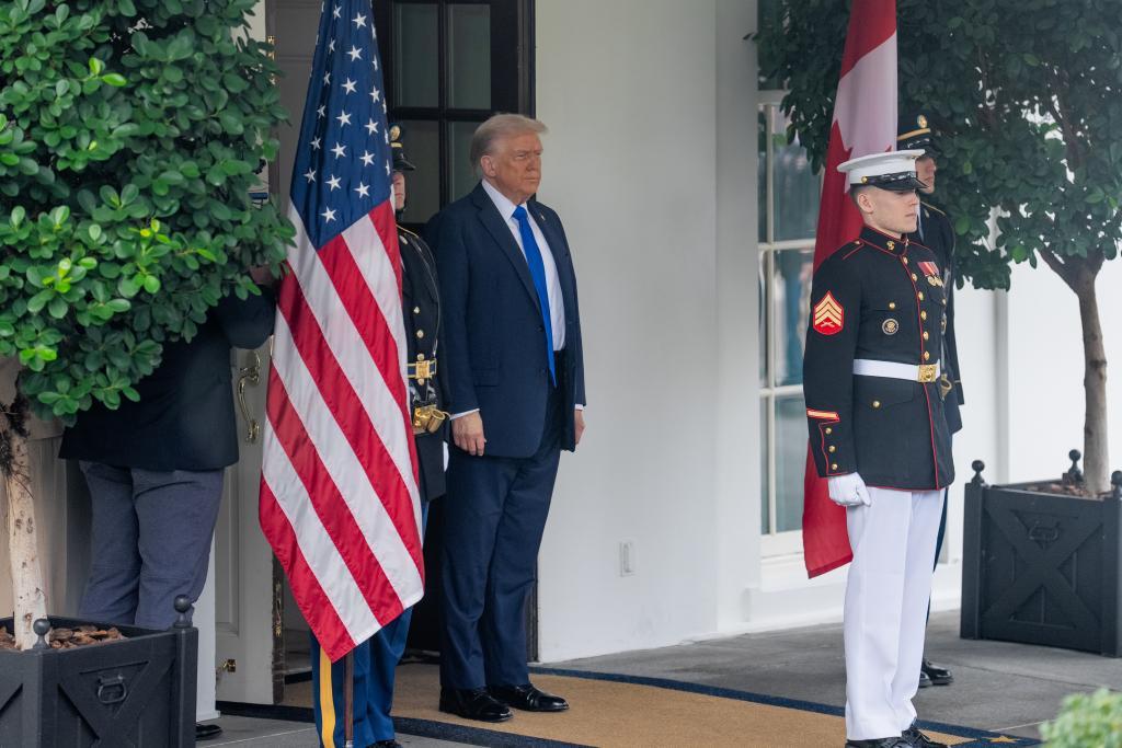 10月7日,在美国首都华盛顿白宫,美国总统特朗普迎候来访的加拿大总理卡尼。新华社记者胡友松摄