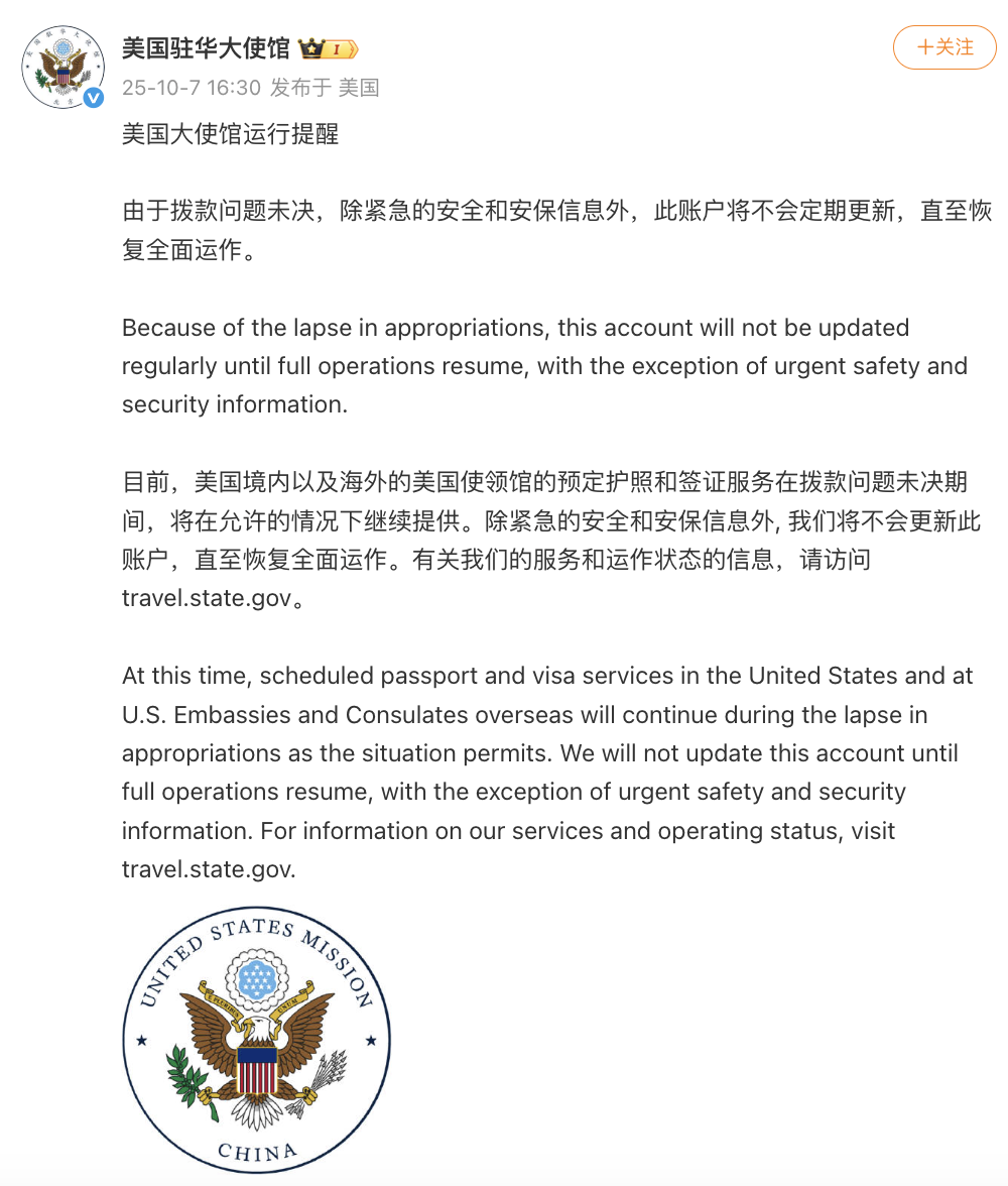 北京时间10月3日下午1时23分,美国驻华使领馆在美国社交平台X上的官方账号上宣布,由于拨款问题未解决,除紧急的安全和安保信息外,此账户将不会定期更新,直至恢复全面运作。