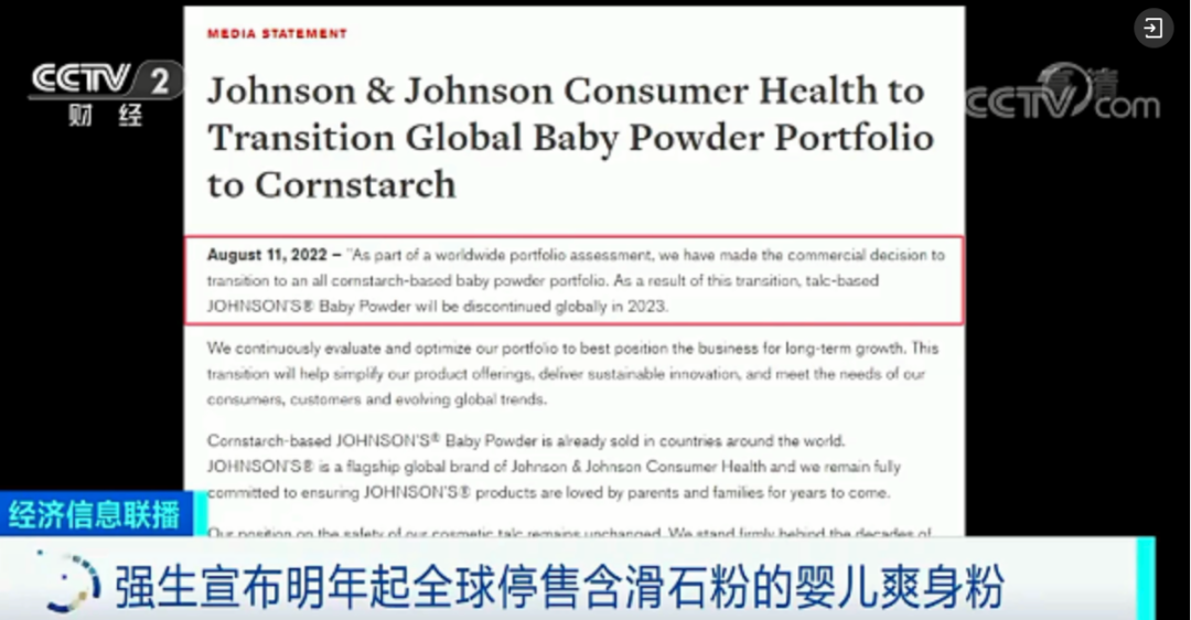 2022年8月,强生公司宣布将于2023年在全球范围内停止销售含滑石粉的婴儿爽身粉报道提到,强生公司面临约上万起来自消费者及其幸存者的诉讼,声称其滑石粉产品因被已知的致癌物石棉污染而导致癌症。