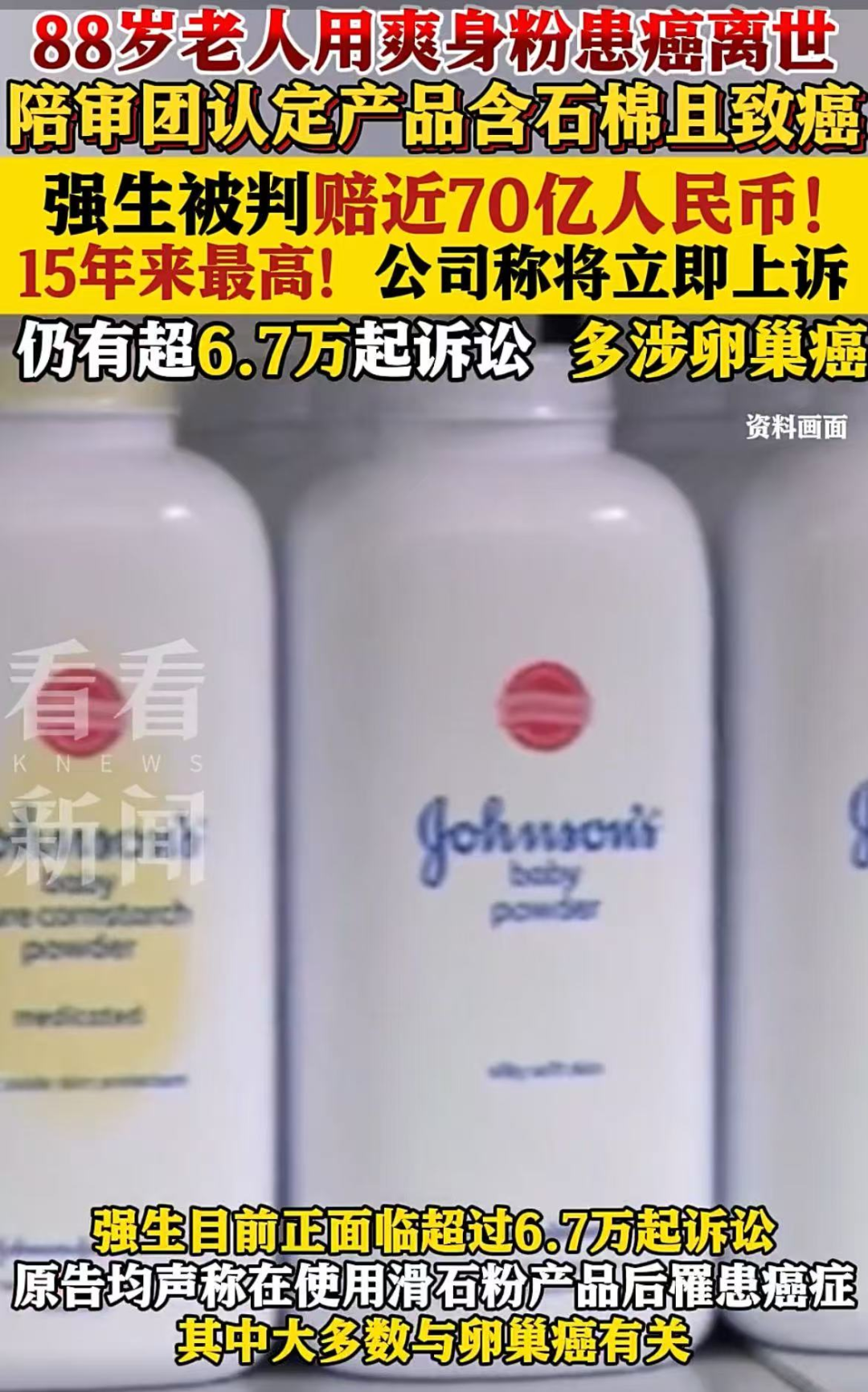 根据法庭文件,强生目前正面临超过6.7万起诉讼,原告均声称在使用婴儿爽身粉及其他滑石粉产品后罹患癌症。其中,指控滑石粉导致间皮瘤的案件仅占一小部分,大多数与卵巢癌有关。