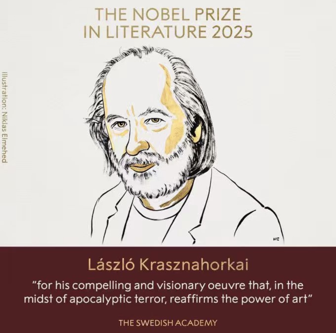 北京时间10月9日19时许,2025年诺贝尔文学奖揭晓,匈牙利作家拉斯洛·卡撒兹纳霍凯(László Krasznahorkai)凭借其“引人入胜且富有远见的作品”获奖,评委会特别强调其作品“在世界末日的恐怖中,再次证明了艺术的力量”。