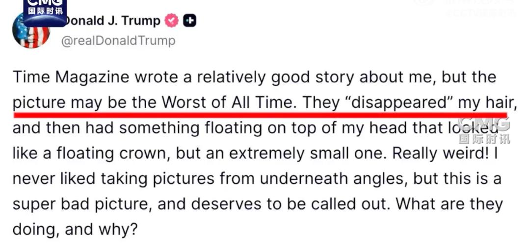特朗普在贴文中称,“《时代》写了一篇关于我的还不错的报道,但却选了可能是史上最差的一张照片,他们‘抹去了’我的头发,然后在我头顶上方放了某种漂浮的东西,看起来像一顶漂浮的王冠,但却极小。真的很诡异!我从来就不喜欢仰拍的照片,这张照片实在太烂了,值得被点名批评。他们到底在干什么,为什么要这么做?”