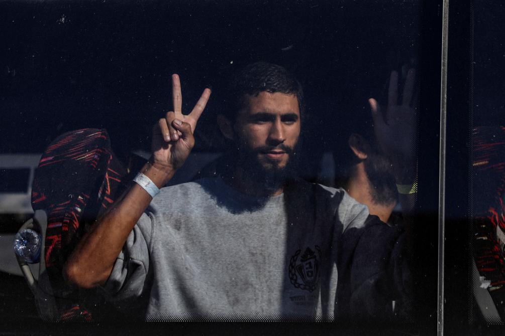 10月13日,巴勒斯坦获释人员乘坐大巴回到加沙地带南部汗尤尼斯。新华社发(里泽克·阿卜杜勒贾瓦德摄)