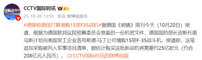 据CCTV国际时讯援引德国《明镜》周刊今天(10月20日)报道,根据为德国联邦议院预算委员会准备的一份机密文件,德国国防部长皮斯托里乌斯计划向美国军工企业洛克希德·马丁公司增购15架F-35战斗机。报道称,这笔追加采购被列入军事项目清单,据估计购买这批新战机将需要约25亿欧元(约合208亿元人民币)。