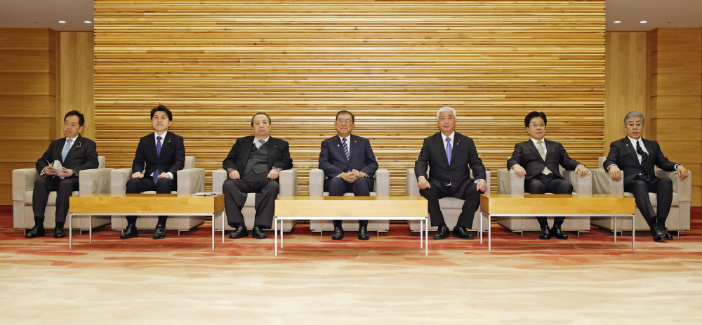 10月21日,在日本东京的首相官邸,日本首相石破茂(中)与内阁成员出席内阁会议。新华社/共同社