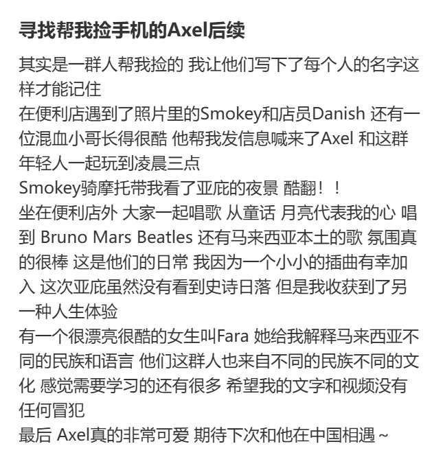 这件事还有意想不到的后续,袁女士又找到了这群捡到她手机的年轻人,来自两个国家的年轻人围桌聊天、唱歌,成为了朋友。