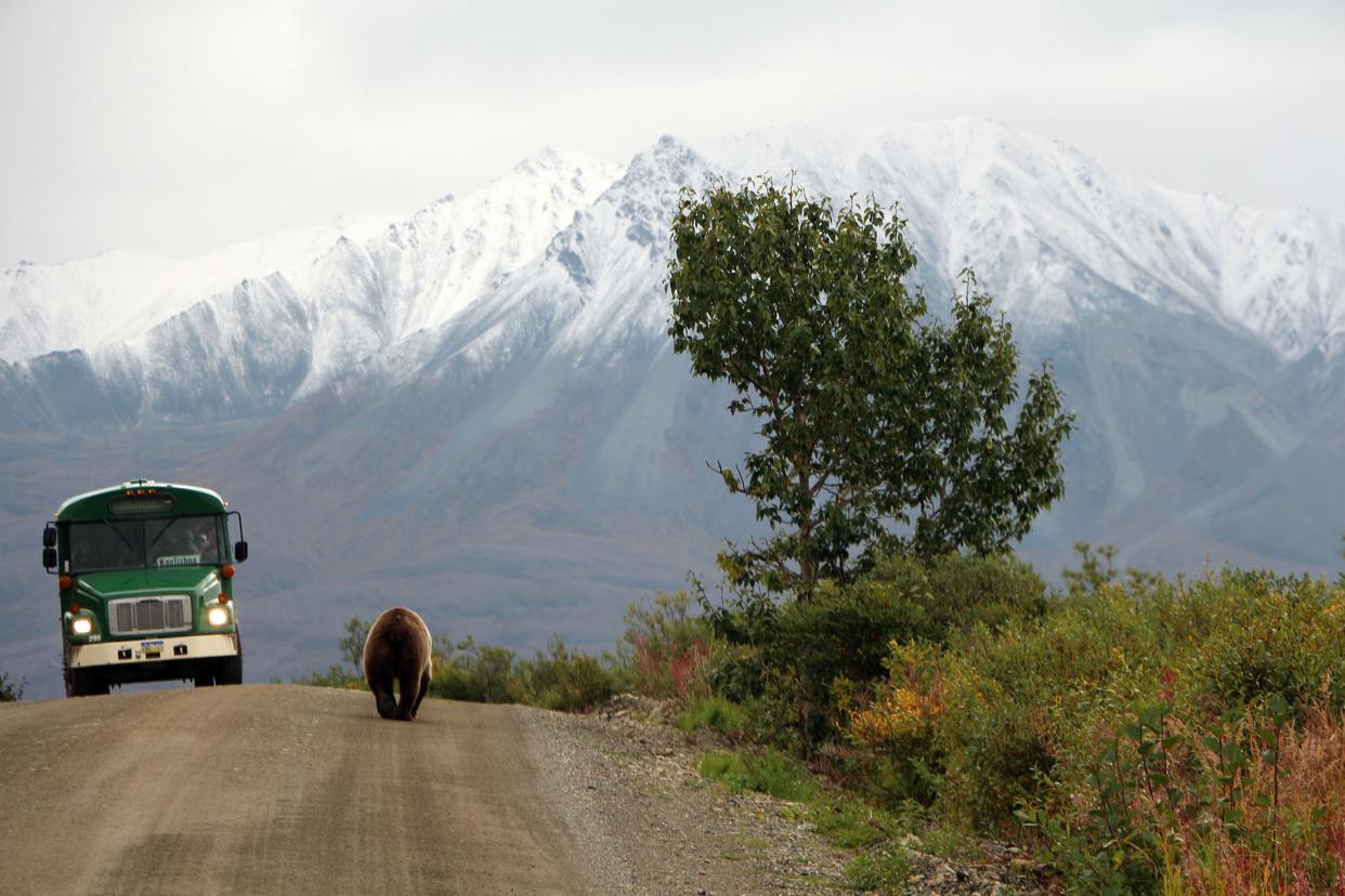 2013年8月29日,在美国阿拉斯加州的迪纳利国家公园,一头棕熊和一辆载着游客的观光巴士在路上不期而遇。新华社记者段卓力摄 内政部还宣布,将根据一项土地交换计划在金科夫与科尔德湾机场之间修建一条长17.7公里的道路,这条路将贯穿伊曾贝克国家野生动物保护区。
