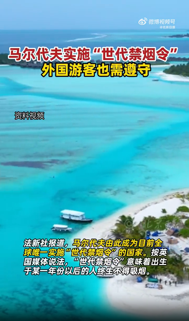 据新华社报道,马尔代夫卫生部11月1日宣布,当天起对出生于2007年1月1日及以后的人员实施“世代禁烟令”,禁令适用范围包括外国游客。