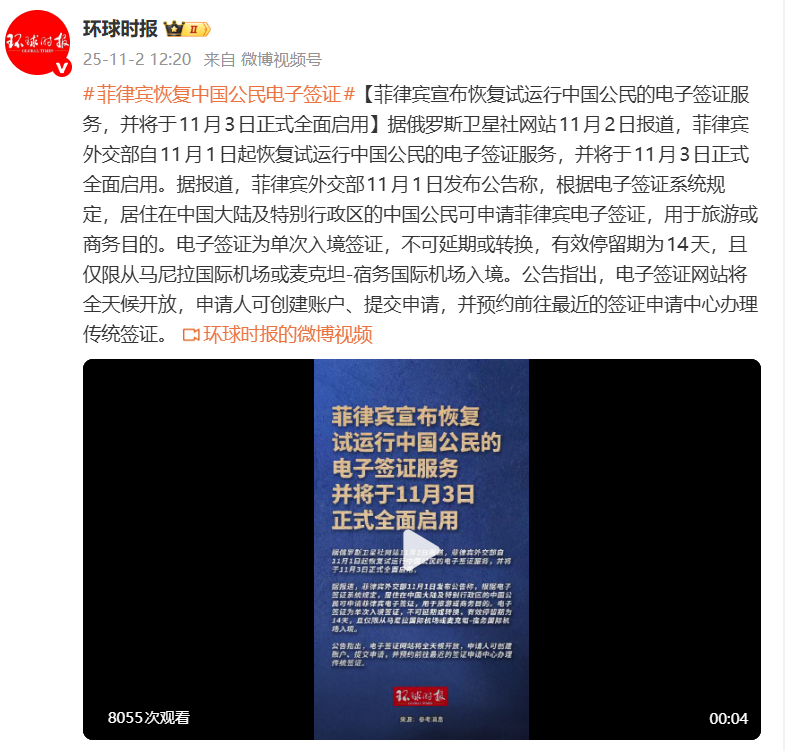 据环球时报援引俄罗斯卫星社网站11月2日报道,菲律宾外交部自11月1日起恢复试运行中国公民的电子签证服务,并将于11月3日正式全面启用。