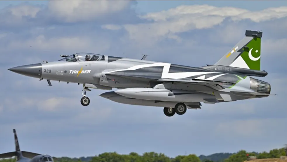 特殊涂装的巴基斯坦空军JF-17“雷电”(中方称“枭龙”)战斗机降落在英国皇家空军费尔福德基地,参加2025年国际航空文身航展。 图源:“The Aviationist”网站