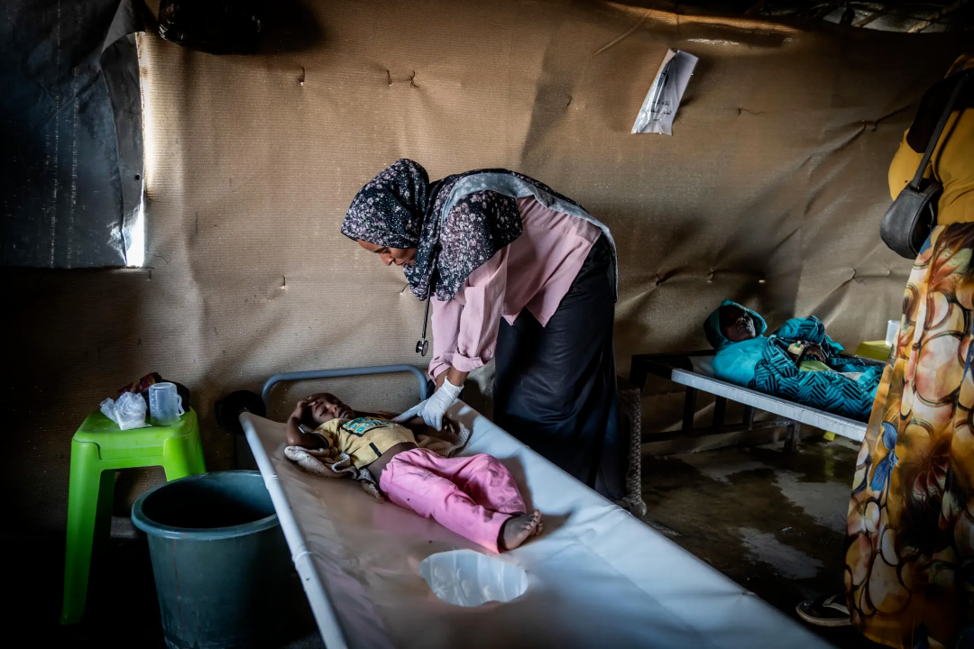 苏丹的一个流离失所者营地中,MSF(无国界医生)霍乱诊所的 Dr. Omnayat El Toom 正在为一名患有霍乱的儿童患者进行治疗/图源:联合国人道主义事务协调厅