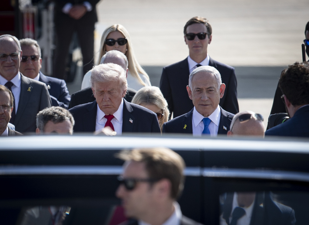 10月13日,在以色列本-古里安机场,以色列总理内塔尼亚胡(中右)迎接到访的美国总统特朗普(中左)。新华社记者陈君清摄