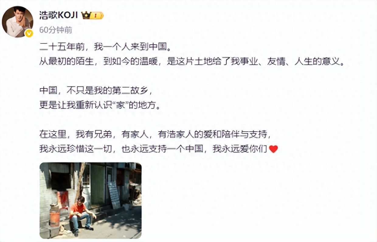 矢野浩二发文称,“二十五年前,我一个人来到中国。从最初的陌生,到如今的温暖,是这片土地给了我事业、友情、人生的意义。中国,不只是我的第二故乡,更是让我重新认识‘家’的地方。在这里,我有兄弟,有家人,有‘浩家人’的爱和陪伴与支持,我永远珍惜这一切,也永远支持一个中国,我永远爱你们”。
