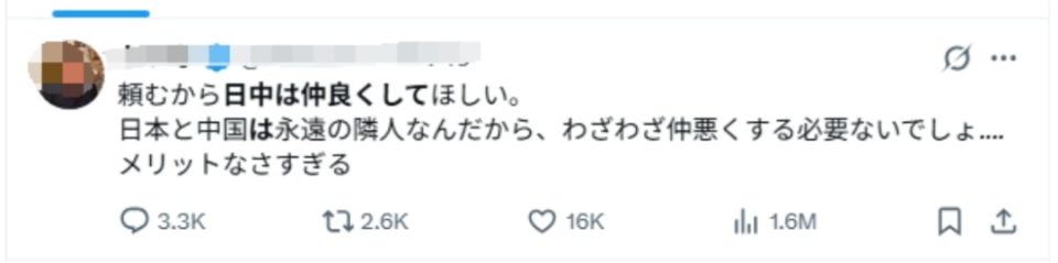 有帖文称,真心希望中日友好。日本和中国是世代相传的邻国,所以没有必要让情况变得更糟,两国交恶有百害而无一利。