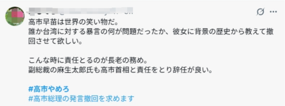 帖文称,“真希望有人能从历史背景出发,好好教教她(高市早苗),让她明白涉台不当言论问题出在哪,然后撤回发言。”帖文还提到,“(自民党)副总裁麻生太郎也该和高市首相一起承担责任,主动辞职才对。”
