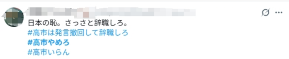 在社交媒体平台上,出现了“高市辞职”“高市住手”“请高市撤回发言”等多个标签。日本网民纷纷表示,高市的错误言论给日中关系埋下隐患,希望她尽快道歉。