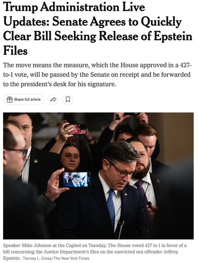 △《纽约时报》报道,众议院以近乎全票通过《爱泼斯坦档案透明法案》,仅数小时后,参议院一致同意,该法案送达参议院即获通过。