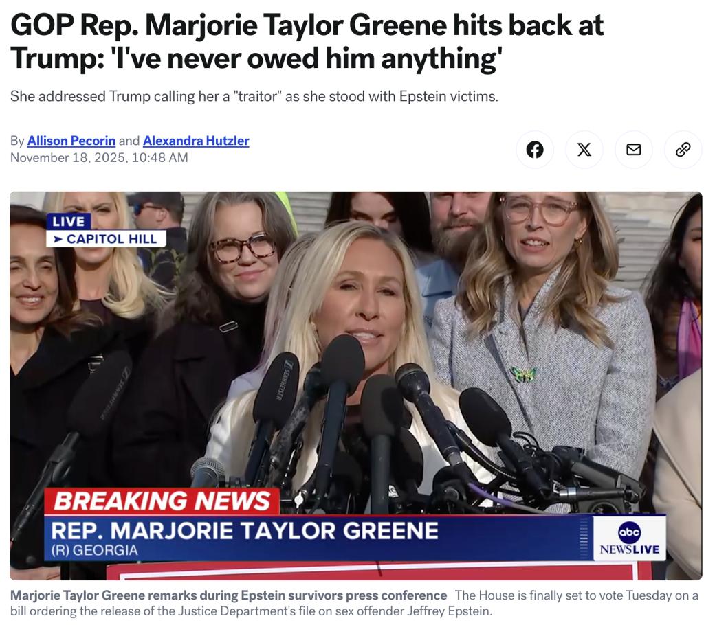 △据美国广播公司报道,共和党众议员玛乔丽·泰勒·格林因坚持要求公开爱泼斯坦档案而与特朗普发生激烈冲突,显示共和党阵营内因此出现裂痕。