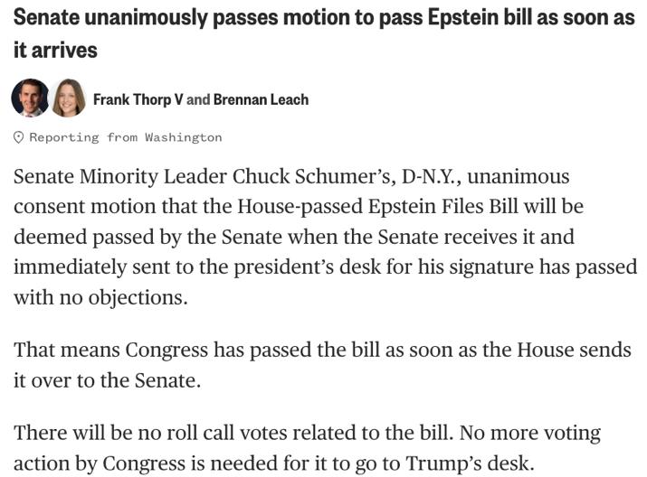几小时后,参议院迅速接招。参议院少数党领袖舒默提出一项一致同意动议,即一旦众议院把通过的法案正式送交参议院,参议院即自动视为通过该法案且不作任何修正,随后直接送交总统签字。由于没有任何参议员提出反对,因此该动议获得通过。哥伦比亚广播公司等主流媒体的直播页面标题直接改成了“参议院批准法案,推动公开爱泼斯坦档案”,并说明该法案“在参议院以一致方式通过”。