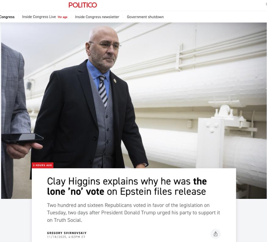 11月18日下午,众议院以427票赞成、1票反对的结果表决通过《爱泼斯坦档案透明法案》,所有民主党人和几乎所有共和党人投了赞成票,仅有路易斯安那州共和党议员克莱·希金斯投下反对票。