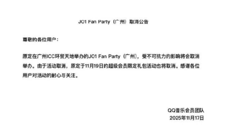 17日晚,QQ音乐在社交网站上发布一则公告称,“原定在广州举办的JO1 Fan Party,受不可抗力的影响将会取消举办。”
