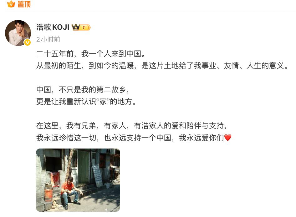 “中国,不只是我的第二故乡,更是让我重新认识‘家’的地方。在这里,我有兄弟,有家人,有浩家人的爱和陪伴与支持,我永远珍惜这一切,也永远支持一个中国,我永远爱你们”。