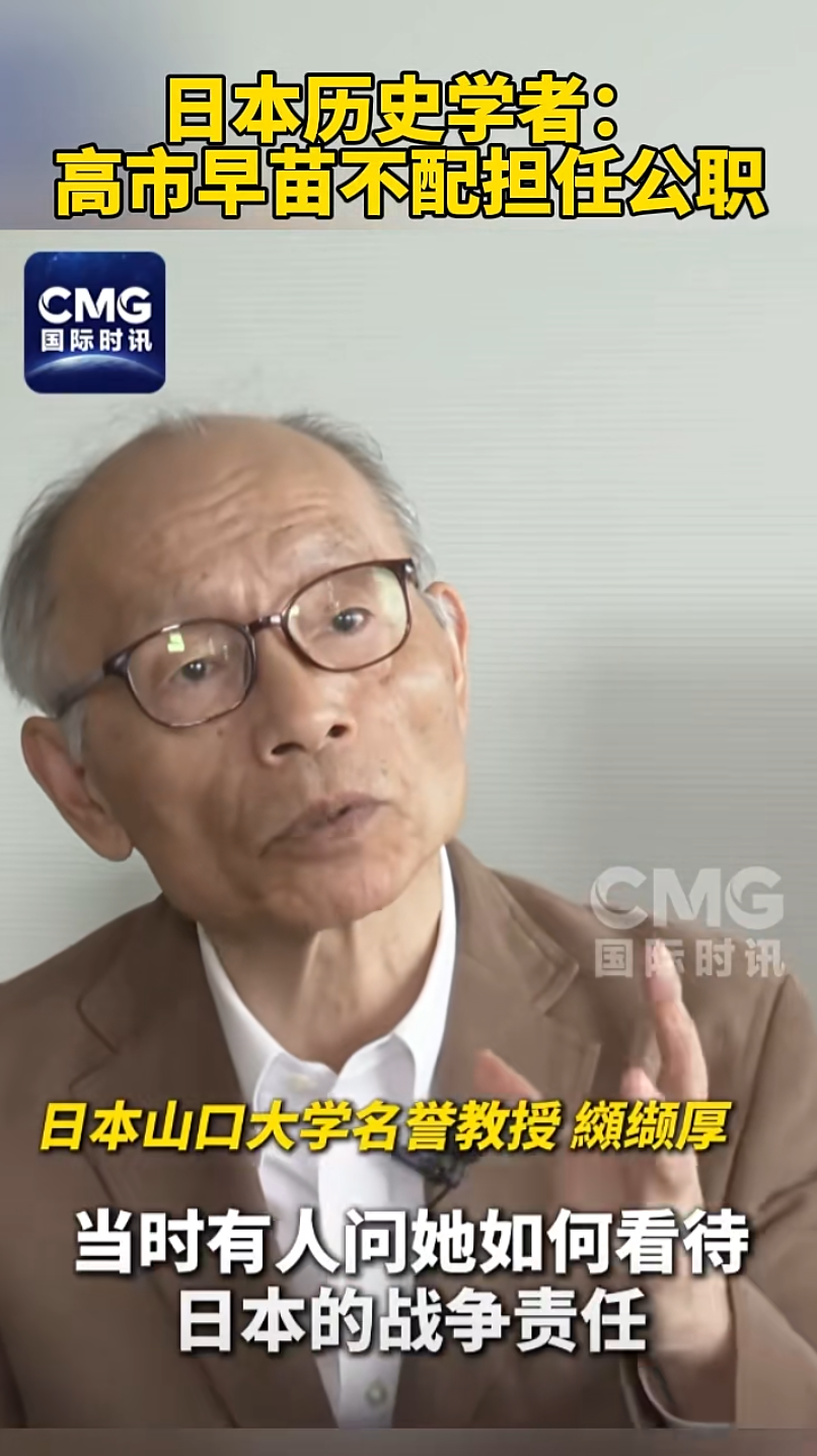 纐缬厚说,他对高市早苗早年曾宣称“战争发生的时候我还没有出生,所以我没有战争责任”的言论记忆犹新。纐缬厚说,高市早苗这样的言论令作为历史学者的他感到震惊。在他看来,在日本担任公职者,都有反思战争的责任,否则会重蹈覆辙。高市早苗有这样的言论,说明她不配担任公职。
