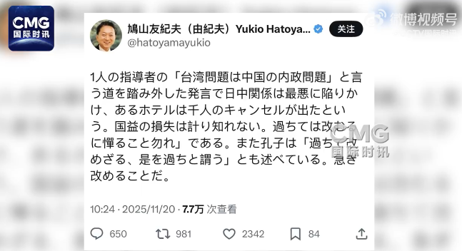 11月20日,据CCTV国际时讯消息,就近期日本首相高市早苗涉台的错误言论,日本前首相鸠山由纪夫当地时间11月20日再次发文:“因为一名领导人发表了偏离‘台湾问题是中国的内政问题’这一正道的言论,日中关系几乎陷入最恶劣的境地,据说有一家酒店出现了一千人的取消预订。国家利益的损失无法估量。孔子说过:‘过则勿惮改’,又说‘过而不改,是谓过矣’。应当尽快加以纠正。”