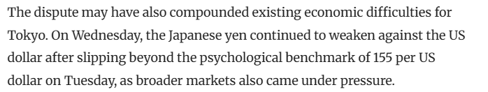 《南华早报》11月19日的一篇文章称,当前的争端或将加剧日本本已存在的经济困境。19日,日元兑美元汇率继18日跌破155日元兑美元的心理关口后继续走弱,同时更广泛的市场也面临压力。