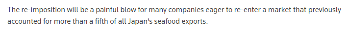 对此,路透社19日的报道称,中国市场份额一度曾占到日本水产品出口总额的五分之一以上。对华水产品出口再次面临停滞,给许多渴望重新进入中国市场的日本企业造成沉重打击。